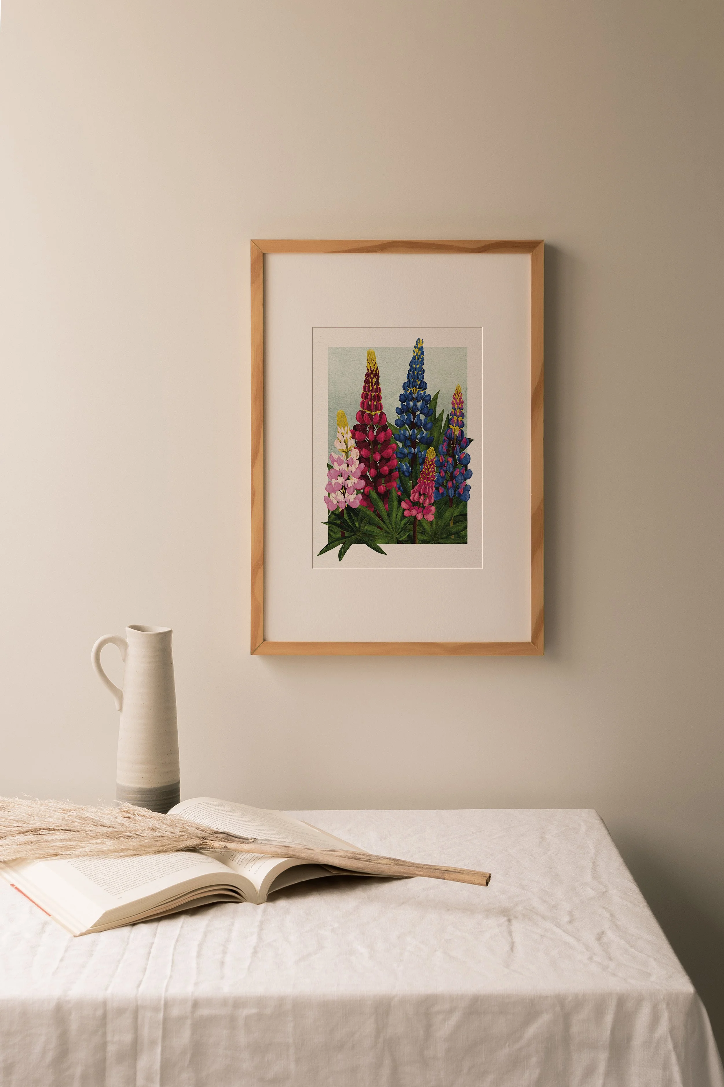 ‘Lupins’ fine art print displayed in soft natural light — a perfect balance of vibrancy and care.